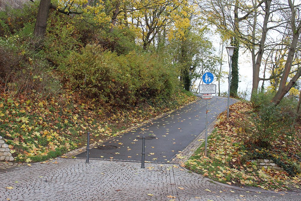 Auch wenn der Bauzaun bereits bis an den Weg heran reicht, der Aufgang über diesen Weg darf benutzt werden. Die Stiftung Thüringer Schlösser und Gärten hatte in einer Pressemeldung verkündet: