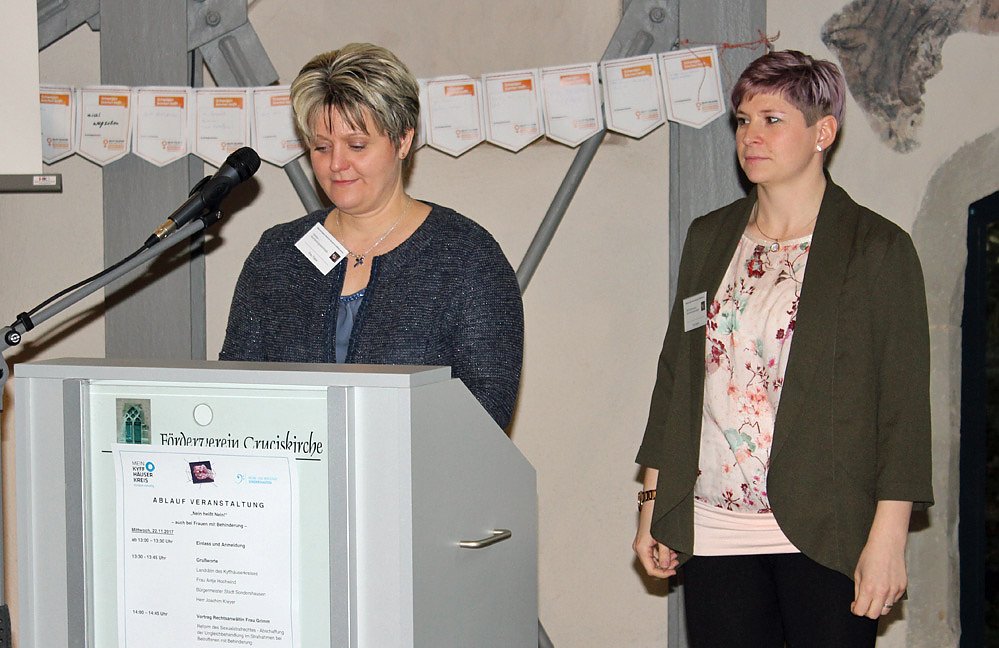 Die Gleichstellungsbeauftragten Katharina Töppe vom Landratsamt Kyffhäuserkreis und Christin Nowak von der Stadtverwaltung Sondershausen hatten Mitarbeiter/innen aus Einrichtungen der Behindertenhilfe, Interessierte aus dem ambulanten und stationären Gesundheitswesen, Mitarbeiter/innen der öffentlichen und freien Jugend- und Sozialhilfe, Mitarbeiter/innen aus den Bereichen Bildung und Erziehung, Anwälte/innen, Richter/innen, Mitarbeiter/innen Polizei, politische Vertreter/innen, Tätige im Kinderschutz und interessierte Bürgerinnen und Bürger in den Bürgersaal des Bürgerzentrums Cruciskirche Sondershausen eingeladen.