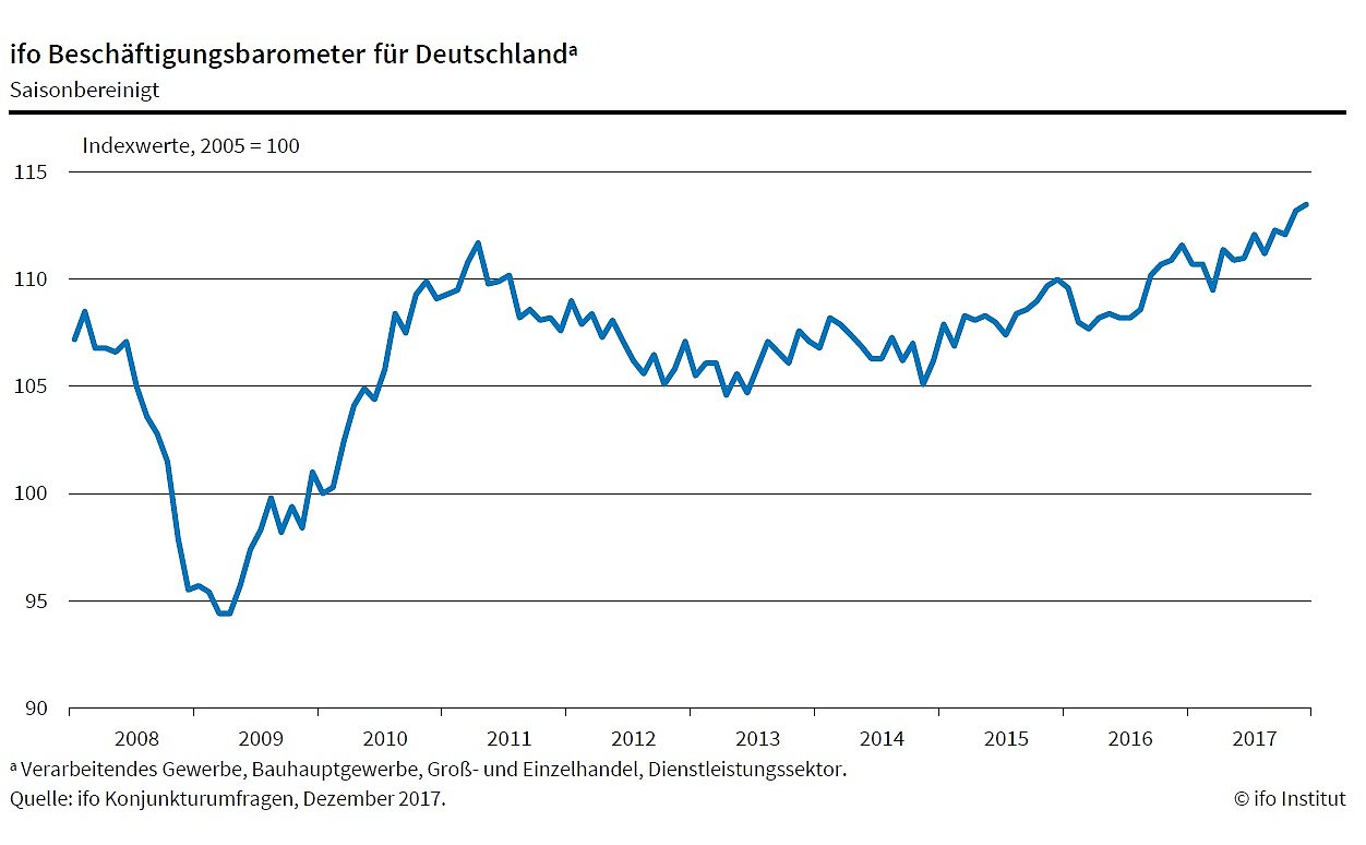 Die deutschen Unternehmen suchen immer mehr Personal. Das ifo Beschäftigungsbarometer stieg auf 113,5 Punkte im Dezember, von 113,2 Punkten im November. Das ist erneut ein historisches Rekordhoch...