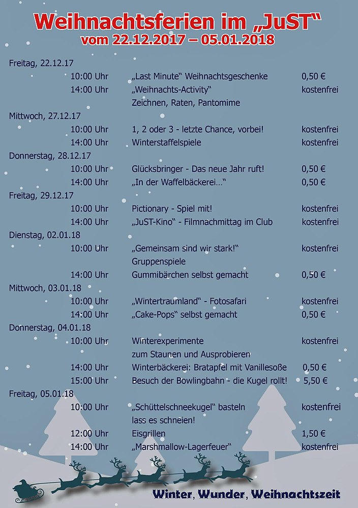 Der Jugend- und Schülertreff JuST hat vom 2. bis 5. Januar 2018 jeweils von 09:00 bis 19:00 Uhr geöffnet. Was alles in den Ferien geboten wird, hier diese Meldung...