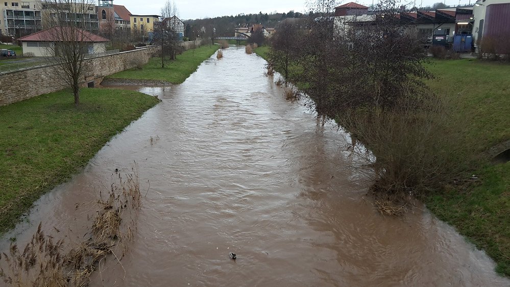 Die Wipper bei Sondershausen ist gut gefüllt, hier eine Aufnahme von kurz nach 14:00 Uhr. Aber es war kein dramatischer Anstieg.