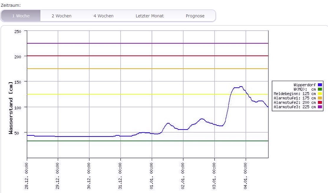 Wenn man die Entwicklung des Pegel flussaufwärts (Wipperdorf) betrachtet, scheint auch das gröbste Überstanden, wie das Bild zeigt (Hochwasser-Nachrichtenzentrale Thüringen.
