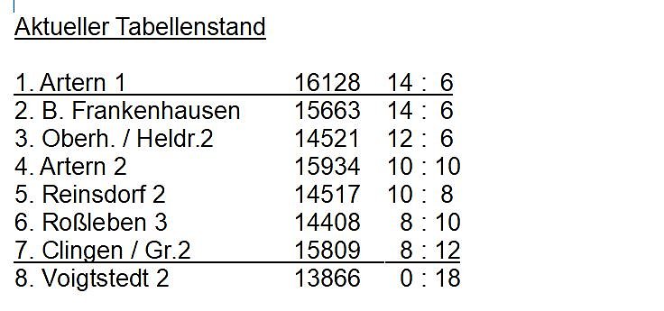Und alle Befürchtungen traten schon im ersten Durchgang ein. Die Gastgeber gewohnt stark, bei den Gästen brachte selbst ein Wechsel nicht die erhoffte Wende. Und so war die Führung der Hausherren, trotz eines wieder super agierten Kl.- Dieter Arnold (439) schon etwas beruhigend (+67). Im Schlussdurchgang versuchten die Gäste noch einmal alles, aber den erhofften Erfolg. Artern spielte sein Pensum souverän runter und gewann am Ende sicher und bleibt weiter das Maß der Dinge.
