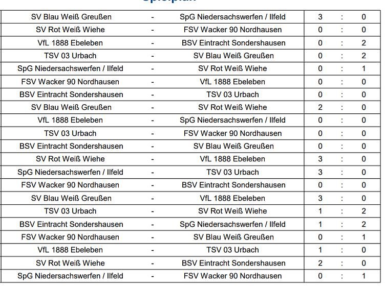Die Mannschaft aus Greußen sicherte sich ungeschlagen (5 Siege, 1 Remis) und ohne Gegentor (11:0) den Titel vor den Mannschaften aus Wiehe und Nordhausen.