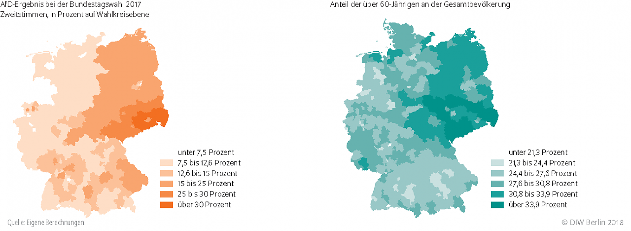 Wenn bestimmte strukturelle Merkmale besonders ausgeprägt sind, schwindet wohl der Rückhalt für etablierte Parteien und steigt offensichtlich der Zuspruch für die rechtspopulistische Partei AfD: niedrige Einkommen, ein starkes Gewicht der Industrie – hier könnte auch die Angst vor Jobverlusten durch Automatisierung und Digitalisierung eine Rolle spielen -, und eine überalterte Bevölkerung in dünn besiedelten Regionen, schlussfolgert Marcel Fratzscher. Gerade auf diese Landstriche im Osten der Republik, in denen viele Ältere leben und aus denen die Jüngeren wegziehen, muss die Politik ihr Augenmerk richten: Die soziale Teilhabe muss verbessert und mehr Gewicht auf öffentliche Investitionen gelegt werden, so dass die Grundversorgung aufrecht erhalten bleibt und diese Regionen wieder lebenswerter werden.