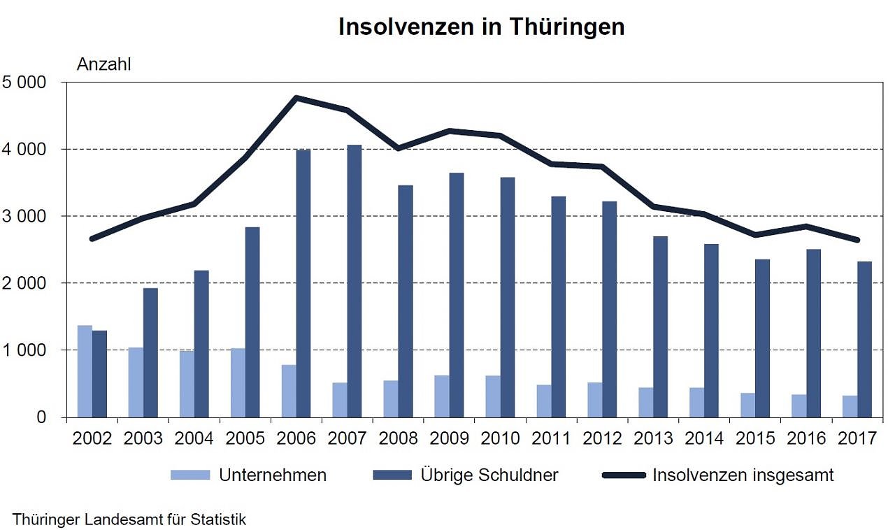 Nach Angaben des Thüringer Landesamtes für Statistik entschieden die Thüringer Amtsgerichte im Jahr 2017 über 2 646 Insolvenzverfahren. Das ist seit Einführung der neuen Insolvenzordnung im Jahr 2001 der niedrigste Wert. Von den Insolvenzverfahren entfielen 12,2 Prozent auf Unternehmen und 87,8 Prozent auf übrige Schuldner...