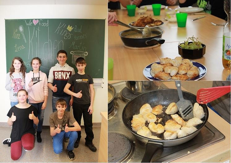 Die Koch AG der Schule gibt es bereits seit 4 Jahren. Zwei Gruppen der Klassenstufen 5 und 7 wechseln sich hier unter der Leitung von Frau Imke Neubert im Wochenrhythmus ab und kochen eifrig, um im Anschluss gemeinsam zu essen und sich über den Kochablauf auszutauschen. Das Kochteam für den Wettbewerb stammt aus der 7. Klassenstufe und umfasst 6 Schüler. Mit dabei: Hannes, zuständig für die Vorspeise - Paul, zuständig für den Hauptgang - Lena, zuständig für die Nachspeise sowie Kira, zuständig für die Tischdekoration und den Service. Weitere Unterstützer des Teams sind Colleen und Martin.