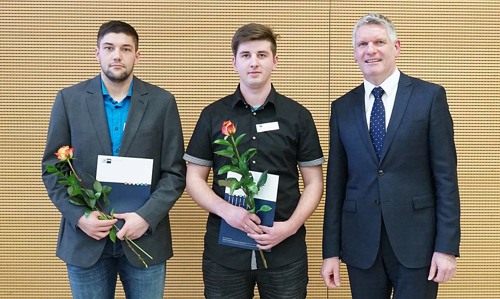 Johannes Brunner aus Weißensee, Werkzeugmechaniker bei der Mubea Tailor Rolled Blanks GmbH sowie Steven Scharfenberg-Gölzer aus Sondershausen, Bürokaufmann bei der Stadtwerke Sondershausen GmbH, nahmen ihre Auszeichnungen in den Räumlichkeiten der Erfurter Kammer von IHK-Abteilungsleiter Thomas Fahlbusch (re.) entgegen.