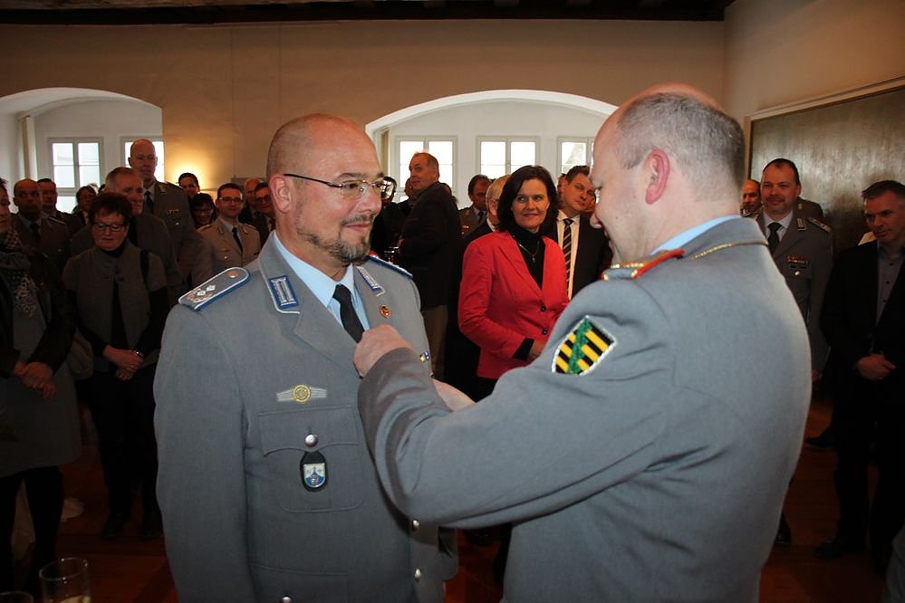 Brigadegeneral Ruprecht von Butler, Kommandeur der Panzergrenadierbrigade 37 Freistaat Sachsen hatte beim großen Appell Oberstleutnant Werneke bereits mit dem Ehrenkreuz der Bundeswehr in Gold aus. Quasi intern erfolgte die Auszeichnung mit der Ehrennadel der Brigade mit der Nummer 137.