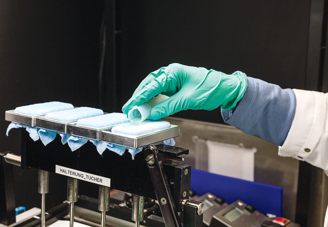 Die Reiniger sollen zeigen, was sie gegen Make-up auf einem Spiegel ausrichten können. (Foto: Stiftung Warentest)
