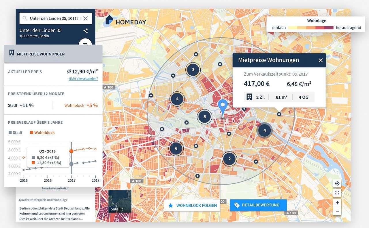 Für die Bestimmung der aktuellen Marktpreise werden zunächst alle veröffentlichten Angebotsdaten der letzten fünf Jahre aus über 350 Datenquellen berücksichtigt, zum Beispiel von Immobilienportalen, Tageszeitungen und regionalen Wochenblättern. Bei der konkreten Preisberechnung setzt Homeday im Anschluss auf einen selbst entworfenen und stetig weiterentwickelten Algorithmus. In den auf Machine Learning basierenden Ansatz fließen zusätzlich zu den aktuellen und historischen Vermietungspreisen mehr als 150 weitere Merkmale ein. Dazu zählen neben den reinen Kerndaten zum Wohnobjekt auch zahlreiche Geo- und sozial-demographische Daten wie der Abstand zu Nahverkehrsmitteln oder die Anzahl von Parks und Schulen in der Nähe zum Wohnort.