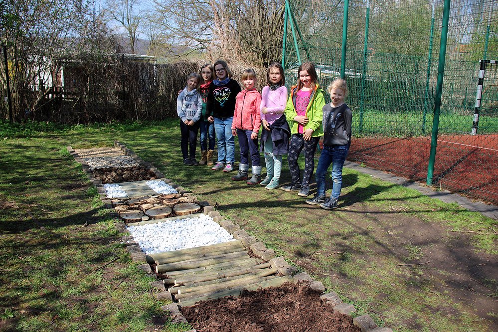 Die Kinder haben gestern natürlich mit geholfen. Hier präsentieren sie den gestern angelegten Barfußpfad.