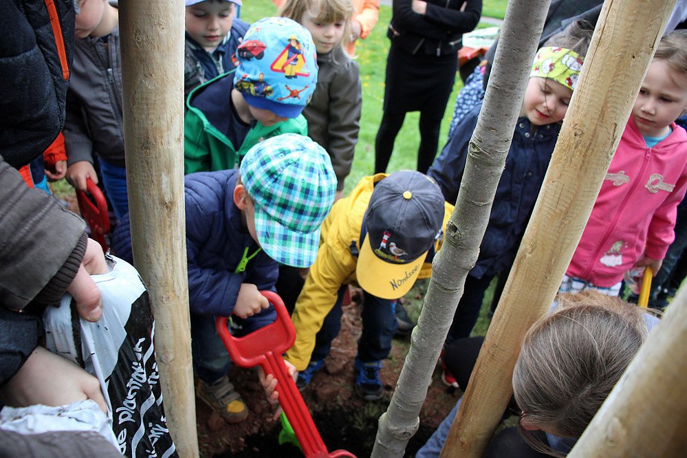 Beim Pflanzen hatten die Mannen des Stadtjugendrings starke Helfer. Die anwesenden Kinder halfen genauso mit, wie Bürgermeister Joachim Kreyer (CDU), der die Kinder bat, passt gut auf den Baum auf.
