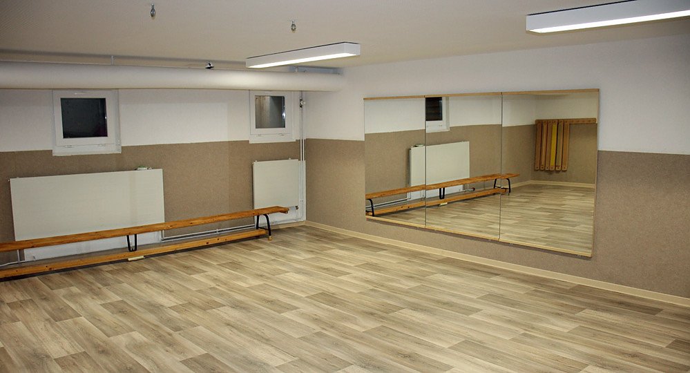 Aber nicht nur die Fassade und die Dämmung wurde realisiert. Im Turnraum wurde ein Höhepunkt geschaffen. Da man eine sehr aktive Tanzgruppe in der Kita hat, gehört natürlich auch ein großer Spiegel für die Übung. Einfach Klasse. Jetzt sah man auch den jüngsten Wasserschaden nicht mehr.