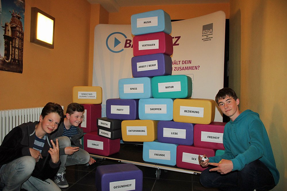 Beim Bauplatz – Was hält dein Leben zusammen - bauten die Jugendlichen eine Lebensmauer aus Bausteinen, die nach ihrer Meinung zu einem glücklichen Leben gehören. In der Diskussion mit der Moderatorin beantworten sich auch die Frage, was passiert, wenn einer der Steine wegfällt? Hier war es die Gesundheit und es zeigte sich, ja die Mauer könnte einstürzen. Diskutiert wurde auch, sind Alkohol und Nikotin eine Alternative?