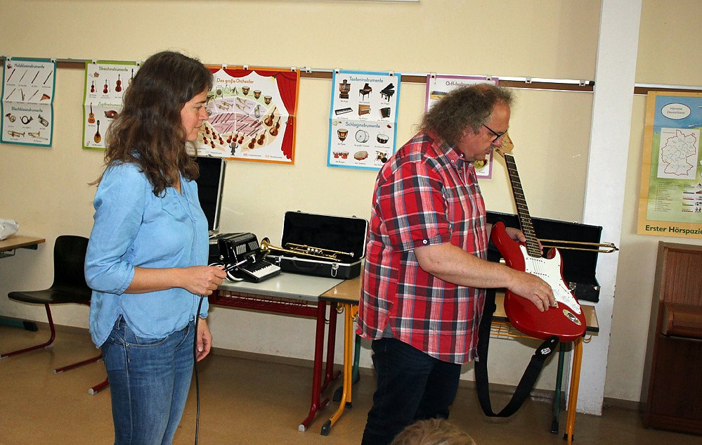 Und wenn das erste Mal in die Saiten einer E-Gitarre geschlagen wird, hörte es sich zur Freude der Kinder so an:
