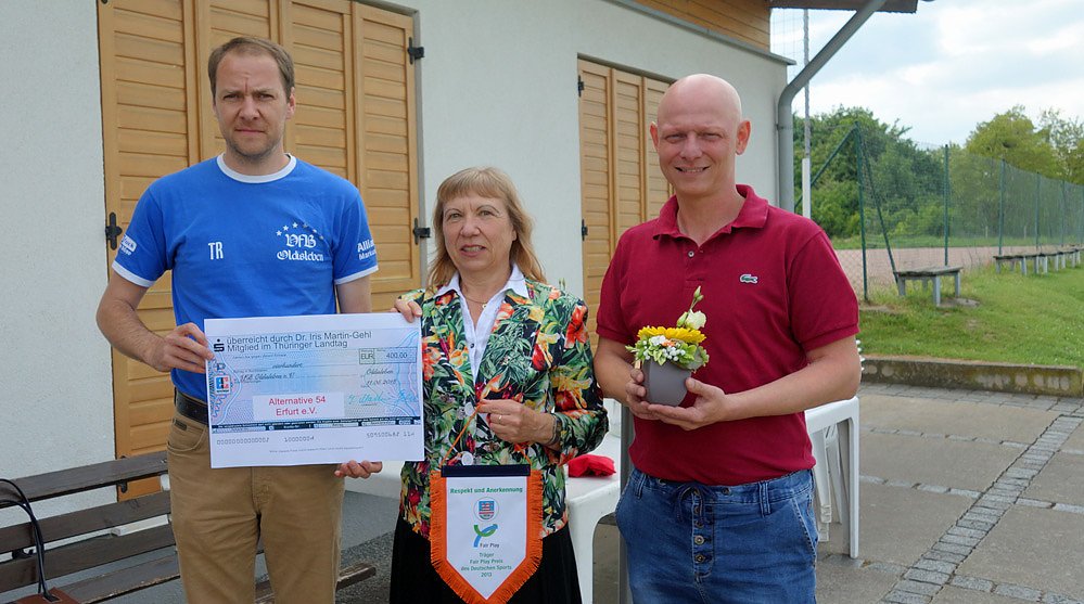 Landtagsmitglied Dr. Iris Martin-Gehl (Die Linke) überreichte am Wochenende 400 € von der Alternative 54 e.V. an den VfB Oldisleben. Dazu diese Meldung...