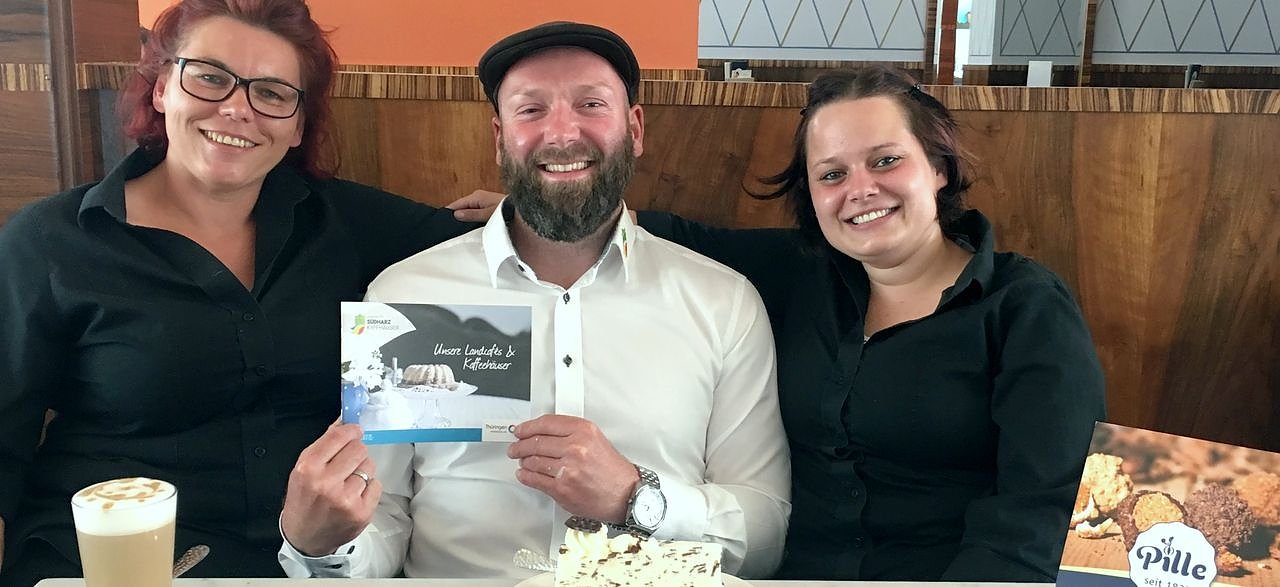 Daniela Janke-Süß (links im Bild) und Julia Schön (rechts im Bild) aus dem Café Pille, dem ältesten Café Thüringens, freuen sich mit Marco Wohlenberg vom Tourismusverband über die neue Broschüre.Die idyllischen Landcafés und einmaligen Kaffeehäuser sind eine Besonderheit im Südharz Kyffhäuser, die wir jetzt in unserer neuen Broschüre den Einheimischen und Gästen präsentieren, sagt Marco Wohlenberg vom Tourismusverband Südharz Kyffhäuser.