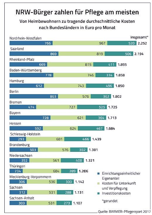 Autor: khhBewohner von Pflegeeinrichtungen in Thüringen müssen in den kommenden Jahren mit erheblich steigenden Eigenanteilen rechnen. Nach einer aktuellen Auswertung der BARMER liegt der Eigenanteil derzeit mit rund 1.200 Euro monatlich fast ein Drittel unter dem bundesweiten Durchschnitt (siehe Grafik). In Nordrhein-Westfalen müssen Pflegebedürftige mit rund 2.250 Euro fast doppelt so viel aus eigener Tasche finanzieren. Es ist zu erwarten, dass sich Thüringen und andere ostdeutsche Bundesländer bei den Eigenanteilen an das Niveau der anderen Länder annähern werden.