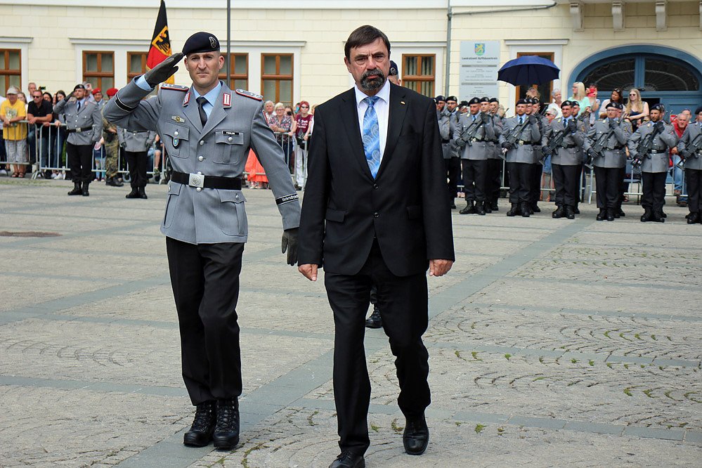 Der Kommandeur Oberstleutnant Stephan Podolski begrüßte die Gäste der öffentliche Vereidigung, wie Landrätin Antje Hochwind (SPD), den Bürgermeister von Sondershausen Joachim Kreyer (CDU) die Ortsteilbürgermeister der Patenortschaften aus Berka und Oberspier, Vertreter der Polizei und viele Sondershäuser, so auch den neugewählten Bürgermeister Steffen Grimm (pl), aber auch viele Verwandte und Bekannte der zu vereidigenden Lehrgangsteilnehmer.