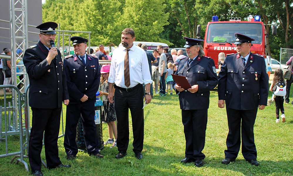 Die Kameraden der Freiwilligen Feuerwehr "Paul Volkmann" aus Jecha erklärten Joachim zum Ehrenmitglied der dortigen Freiwilligen Feuerwehr. Damit würdigen wir, so Wehrleiter Matthias Sickel (li.), das jahrelange Engagement für die Freiwilligen Feuerwehren in der Stadt.