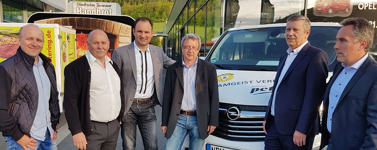 Vor dem Transporter stehend, der Geschäftsührer der Peter Gruppe, Andreas Peter und der Centerleiter Marco Wuttke bei der Übergabe des Fahrzeuges mit Vorstandsmitgliedern der Eintracht Sondershausen