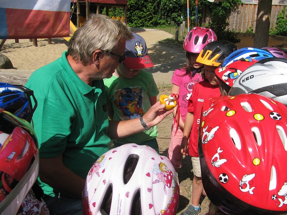 Vor dem Parcours mit Spielfahrzeugen wurde die Wichtigkeit des Tragens von Fahrradhelmen erläutert. Anschaulich wurde es durch einen Melonen- und Eierhelmtest dargelegt.