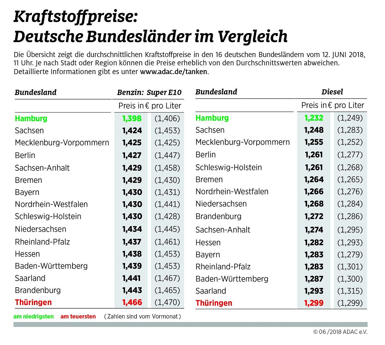 In der aktuellen Untersuchung hat der ADAC am heutigen Dienstag um 11 Uhr die Preisdaten aller 14.000 bei der Markttransparenzstelle erfassten Tankstellen ausgewertet und den Bundesländern zugeordnet. Die ermittelten Preise stellen eine Momentaufnahme dar. Unkomplizierte und schnelle Hilfe für alle Autofahrer, die beim Tanken sparen wollen, bietet die Smartphone-App ADAC Spritpreise. Ausführliche Informationen rund um den Kraftstoffmarkt gibt es zudem unter www.adac.de/tanken.