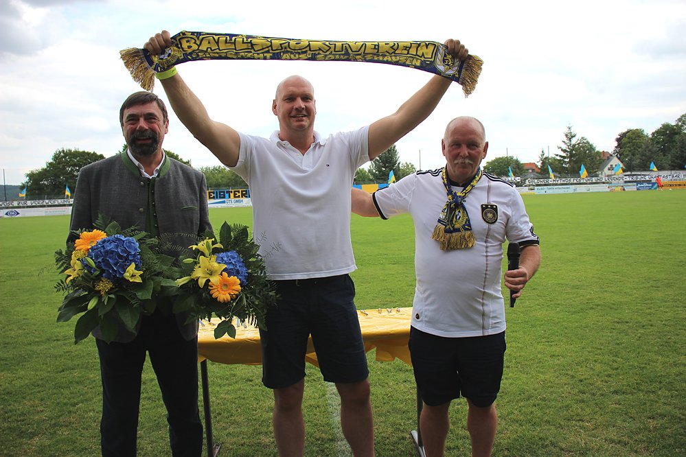 Kreyer war Gründungsvorsitzender des Vereins. Begrüßt auf dem Göldner und mit einem Fanschal ausgestattet wurde der zukünftige Bürgermeister Steffen Grimm.