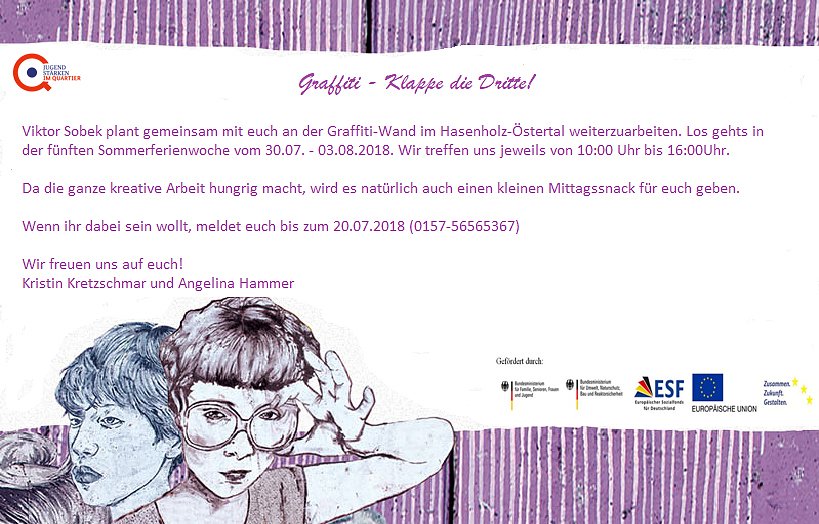 Autor: khhDer Workshop Graffiti findet vom 30.07. bis 03.08. statt. Aber anmelden muss man sich bis 20.07.2018.