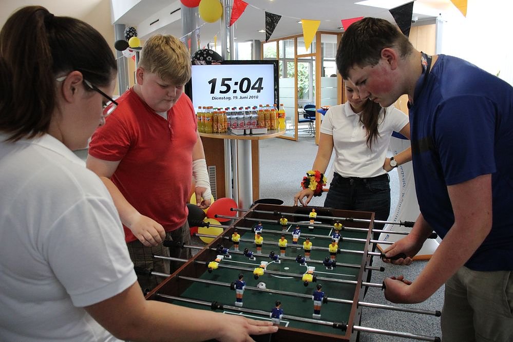Am Nachmittag fanden sich Mädchen und Jungen aus dem Nachmittagsprogramm des JUST Sondershausen in der Filiale der VR-Bank Sondershausen ein. Ausgespielt wurde ein Tischfußball-Turnier aus Anlass der zurzeit laufenden Fußballweltmeisterschaft.