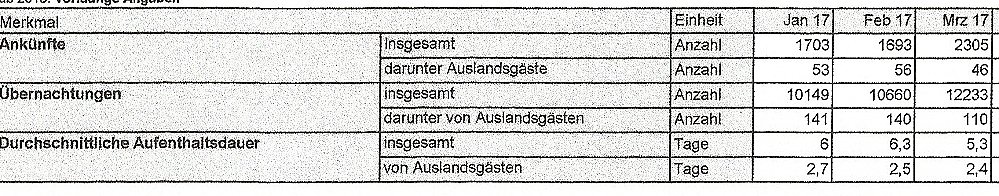 Von Januar bis März ist die Zahl der Gäste um 588 Personen gestiegen, das entspricht einem Plus von 19.3 Prozent. Bei den Übernachtungen gab es ein Plus von 2.874 Personen, das sind 8,7 Prozent mehr. Gerade diese Steigerung zeigt, dass sich nicht nur die Zahl der Tagesgäste gesteigert hat.