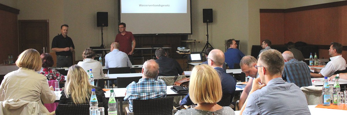 Der Fachbereichsleiter Bau und Ordnung, Karsten Kleinschmidt (li.) hatte die Begrüßung und Moderation übernommen und Holger Diening, Referent im Thüringer Ministerium für Umwelt, Energie und Naturschutz den Vortrag über wichtige Punkte des zukünftigen Gesetzes, welches sich noch im Landtag zur Diskussion befindet und 2019 in Kraft treten soll.