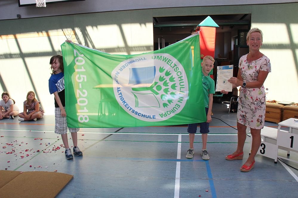 Ein Höhepunkt heute, die e beiden Schulsprecher Clemens Walter und Niklas Esche präsentierten die Fahne von der Erringung (Verteidigung) des Titels Umweltschule, kn berichtete bereits.