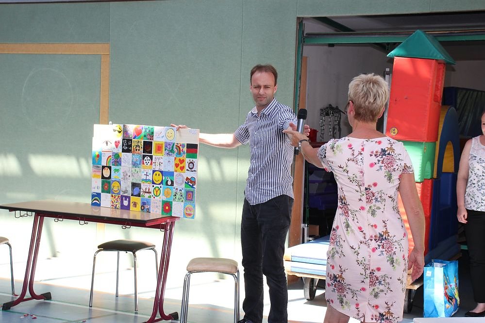 Viel Beifall gab es auch für Vati Holger Penndorf. Er brachte eine Idee aus einer Braunschweiger Schule mit. Die Schülerinnen und Schüler hatten Kacheln selbst bemalt, die an zu einem Bild gerahmt wurden. Das Bild wird dann in der Schule aufgehangen.