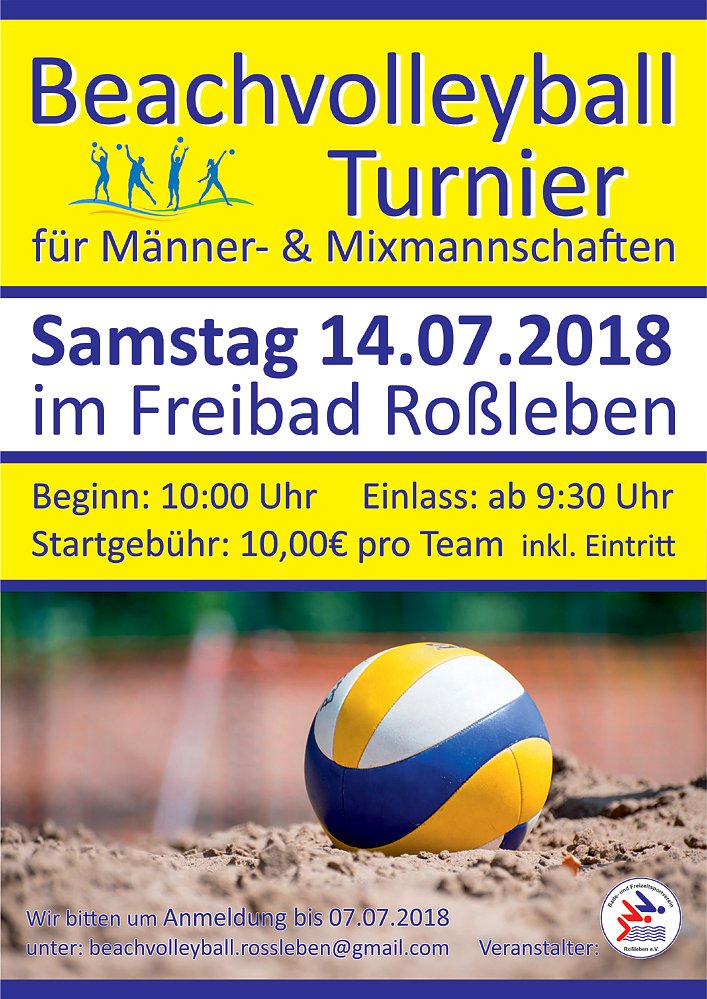 Am Samstag, den 14.07.2018, veranstaltet der Bade- und Freizeitsportverein Roßleben e.V. sein diesjähriges Beachvolleyballturnier. Männer- und Mix-Mannschaften können sich ab sofort unter beachvolleyball.rossleben@gmail.com anmelden. Beginn im Freibad Roßleben ist 10:00 Uhr (Einlass ab 9:30 Uhr).