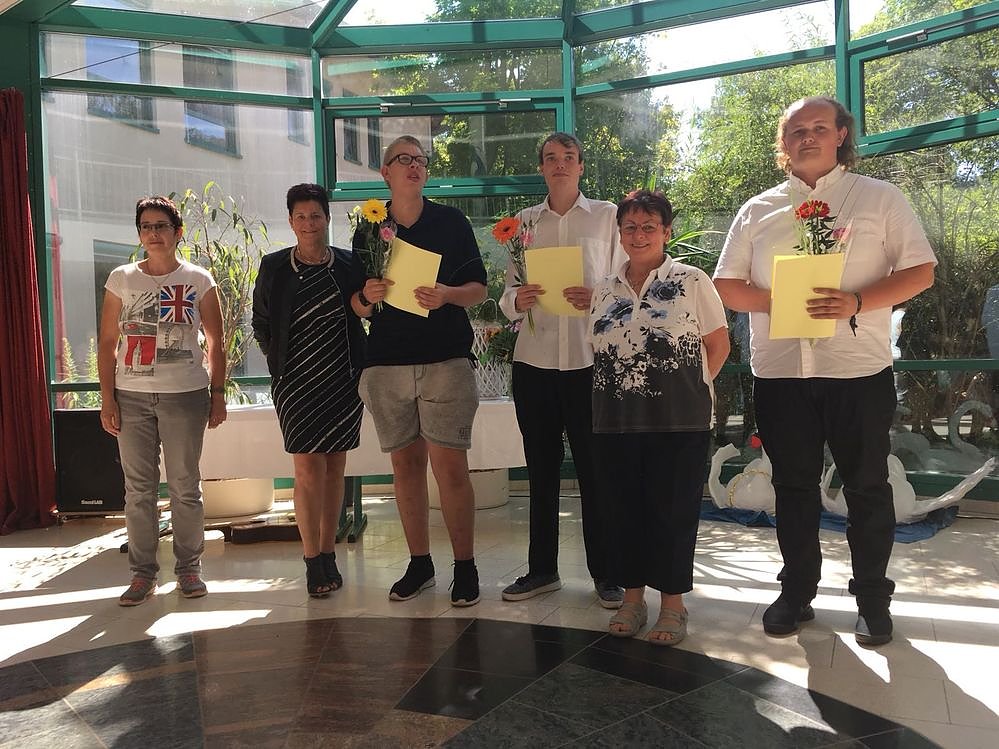Nach dem Programm der Schüler folgte die Zeugnisausgabe bei dem ihre Lehrerinnen Frau Franke und Frau Rechenbach, Frau Günscht vom Schulteil für geistige Entwicklung des Förderzentrum, sowie ihre Schulleiterin Frau Barbara Reichhard persönliche Worte an jeden einzelnen ihrer Schützlinge richteten. Die Abschlussschüler, bedankten sich, wie schon in der Zeugnisausgabe sichtbar war, unter einigen Tränen bei all ihren Lehrkräften, sowie der Schulleitung und weiteren Begleitern, wie ihren Familien für die emotionale und tatkräftige Unterstützt während ihrer Schulzeit.