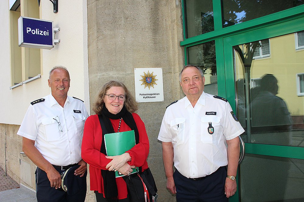 Empfangen wurde sie vom Leiter der Landespolizeiinspektion Nordhausen, Polizeidirektor Detlev Schum (li.) und Leiter der PI Polizeioberrat Hartmut Wachtel. Auch wenn heute Tag des Kusses ist, hier begrüßte man sich traditionell per Handschlag. Zuerst gab es Glückwünsche für Marx, da sie seit gestern auch Mitglied des Stadtrates Sondershausen ist. Marx überbrachte Grüße von Sondershausens Bürgermeister Steffen Grimm.