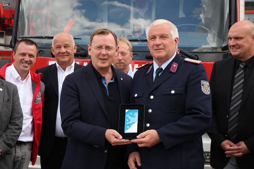 Nach dem Gruppenbild hatte der Ministerpräsident noch eine Aufmerksamkeit für den Stadtbrandmeister Frank Meißner.
