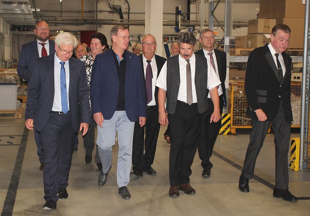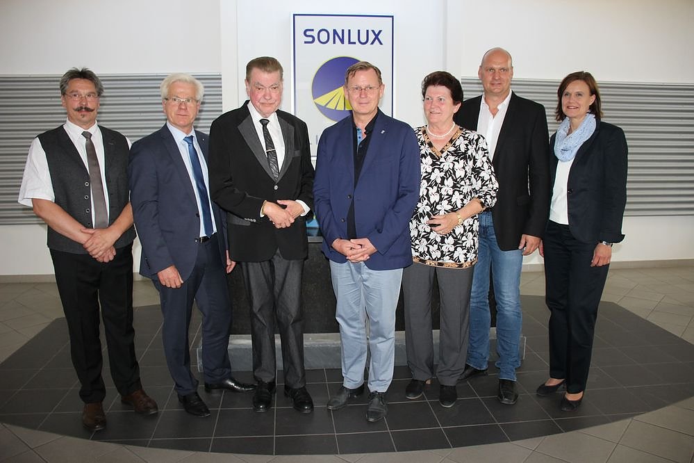 In der ersten reihe, Reiner Jürgens (Managing Director von RZB Lighting dem Hauptwerk - (Rudolf Zimmermann GmbH) in Bamberg ), Minsterpräsident Bodo Ramelow, Steffen Schöllhorn Betriebsleiter Sondershausen und Gesellschafter Dr. Alexander Zimmermann.