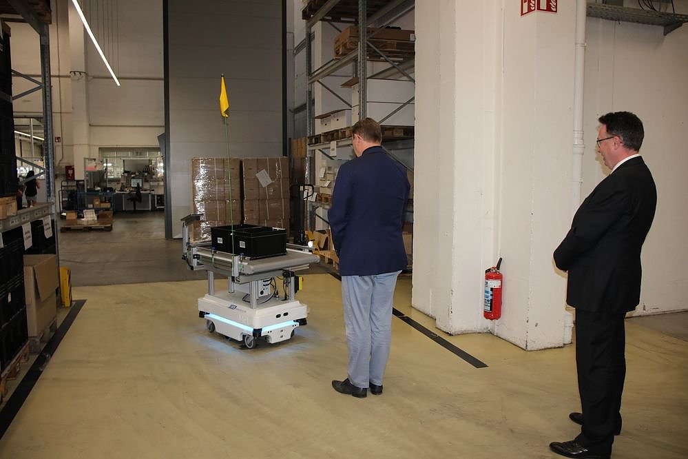 Ein Transportroboter erkennt, dass eine Person im Wege steht und hält automatisch an.