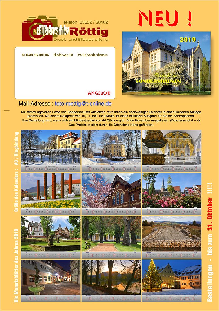 Das Bildarchiv Rötting bietet einen Kalender unter dem Titel: "Verliebt in Sondershausen" mit 13 jahreszeitlich angepassten Motiven aus Sondershausen zum Bestellen an.