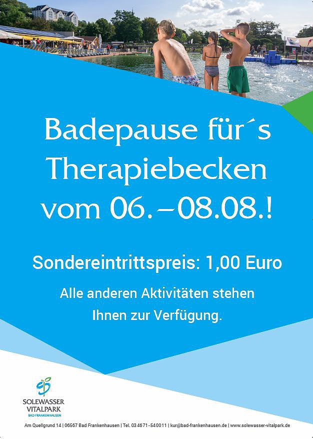 Am 18. August 2018 findet von 10:00 Uhr bis 24:00 Uhr das 2. Schwimmbadfest im Solewasser-Vitalpark statt. Neben den vielen Angeboten für Groß und Klein ist eine Anmeldung und Teilnahme an der ersten Weltmeisterschaft im Brustrückwärtsschwimmen möglich. Anmeldung unter: moebius@bad-frankenhausen.de oder Telefon: 03 46 71 – 71 71 2.