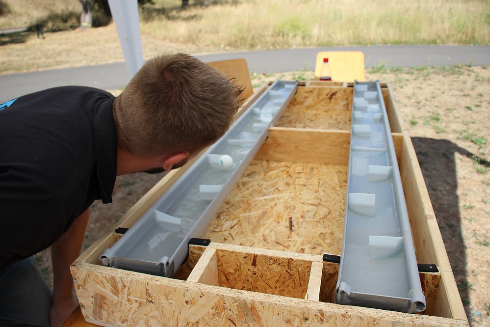 Toni machte es vor. Bei diesem Spiel, das leicht nachzubauen ist, geht es um einen Wettbewerb, wer pustet den Ball am schnellsten durch die Wasserrinne.