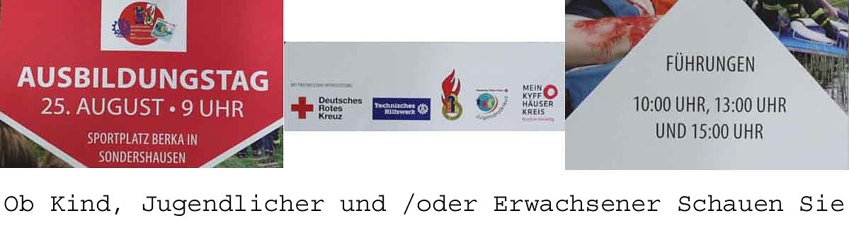 Der Ausbildungstag der Kinder und Jugendlichen der Hilfsorganisationen DRK, THW und der Freiwilligen Feuerwehren findet am Samstag den 25. August im Ortsteil Berka von Sondershausen statt. Mit Zentrum Sportplatz Berka Bilden die Hilfsorganisation in einem gemeinsamen Ausbildungstag ihre organisierten Kinder und Jugendlichen aus.