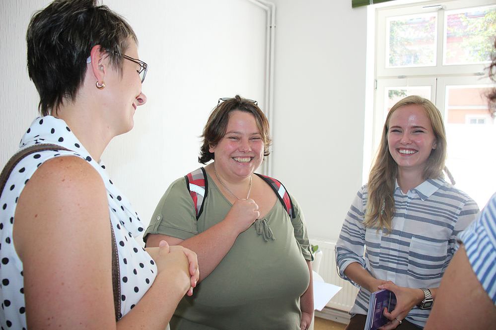Die Fachbereichsleiterin Kultur und Soziales der Stadt Sondershausen, Mareen Biedermann (li) führte mit Janina Zeich erste Gespräche. Auch Vertreter der Düne und weiterer Organisationen nahmen an der Eröffnung teil.