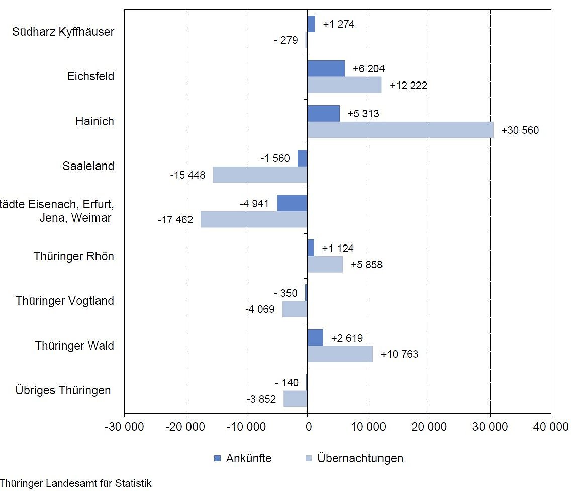 Aber auch einige kleinere Reisegebiete konnten für das 1. Halbjahr 2018 eine positive Bilanz ziehen. Hier sind im Besonderen die Regionen Hainich und Eichsfeld zu erwähnen. In das Reisegebiet Hainich kamen 5 313 Gäste mehr (+8,0 Prozent) als im 1. Halbjahr 2017, die auch deutlich mehr Übernachtungen buchten (+30 560 bzw. +15,4 Prozent).
