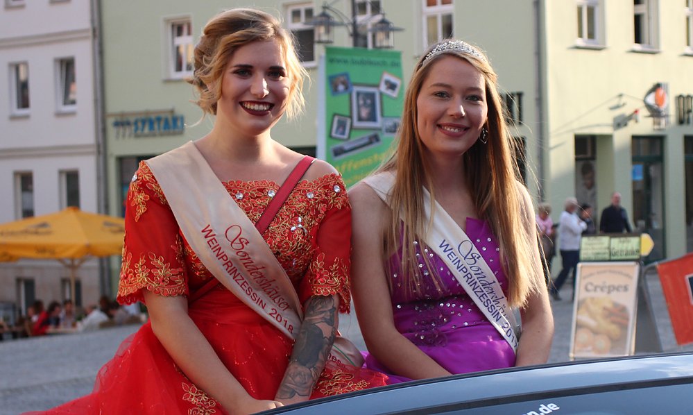 Hier fuhr Vanessa I (li. noch ungekrönt) zusammen mit ihrer Vorgängerin Shantel I. auf dem Markt vor, mit Chauffeur Thomas Koch vom Werbering Sondershausen. Vanessa I. hat nach ihrer Krönung das Weinfest eröffnet und stand anschließend für Gespräche, Fotos und Autogramme zur Verfügung.