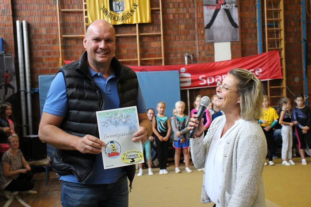 Das erste Mal als Bürgermeister dabei war Steffen Grimm. Er begrüßte die jungen Turner und die vielen Muttis und Vatis in der Halle. Von der Abteilungsleiterin Turnen des SV Glückauf Sondershausen Sabine Angelstein gab es Urkunde für die Mitgliedschaft in diesem sehr erfolgreichen Turnverein.