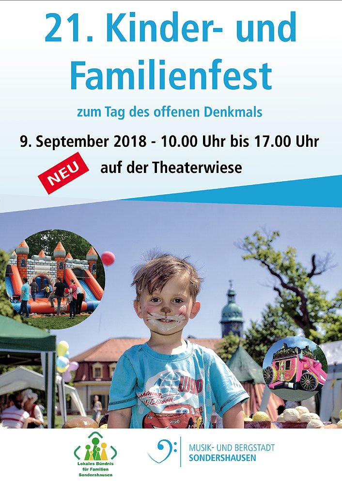 Am Sonntag, dem 9. September 2018, von 10.00 – 17.00 Uhr veranstalten die Stadt Sondershausen und das Lokale Bündnis für Familie das schon zur Tradition gewordene Kinder- und Familienfest. In diesem Jahr ist es bereits das 21. Kinder- und Familienfest. Neu ist diesmal der Veranstaltungsort. In diesem Jahr wird das Fest auf der Theaterwiese und dem Marstallvorplatz gemeinsam mit den Mitarbeitern/innen des Schlossmuseums durchgeführt. Die Stadt Sondershausen begeht 2018 das 25jährige Bestehen des Tages des offenen Denkmals. Es sind viele gemeinsame Aktionen für Kinder und Eltern geplant.